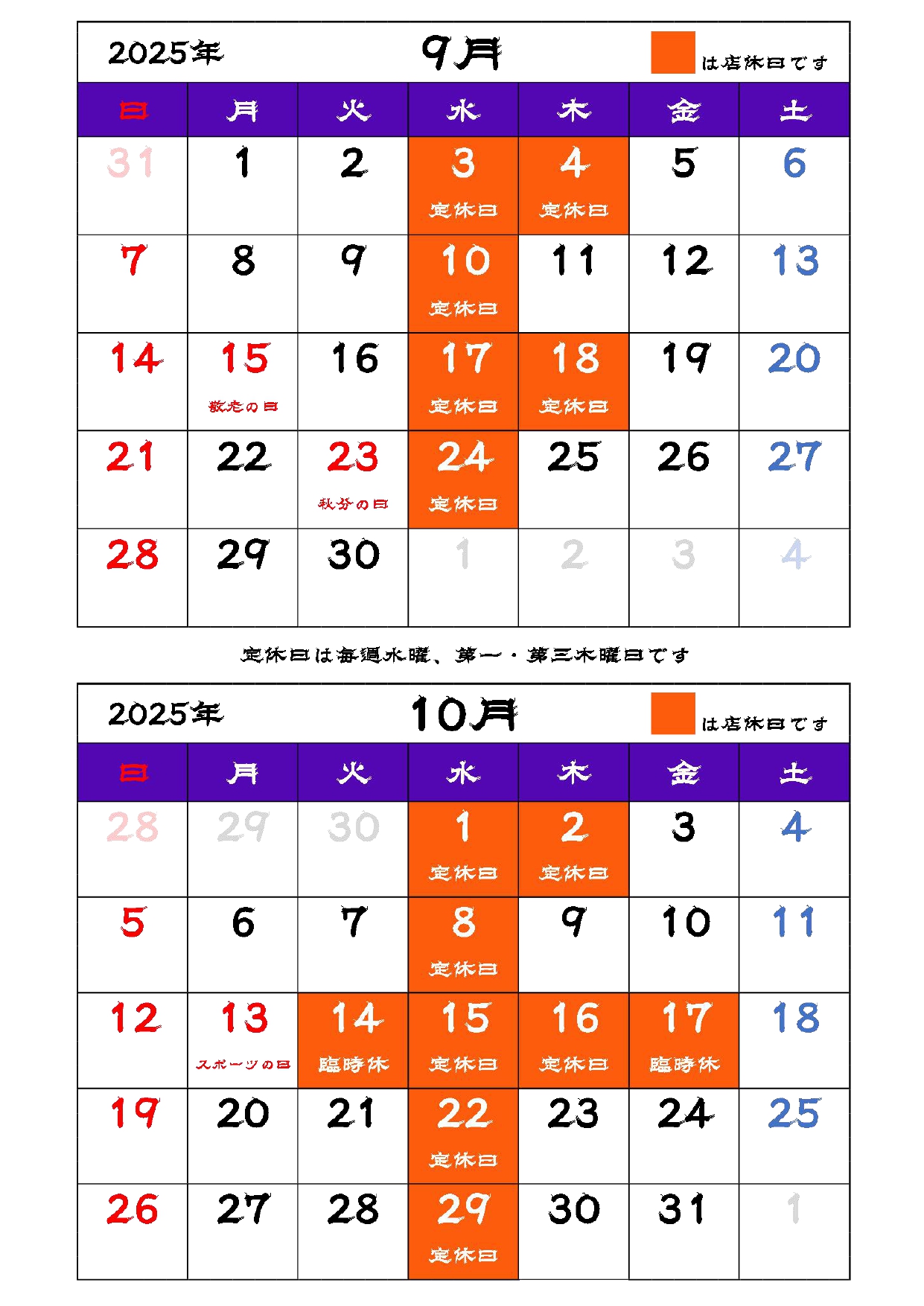 9月、10月は下記カレンダー通りに営業させていただきます。