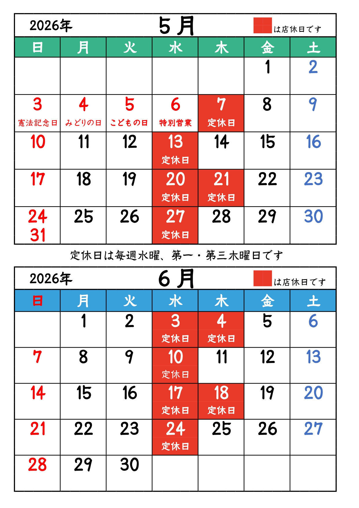 5月6日は水曜ですが、祝日の為、臨時営業いたします。
